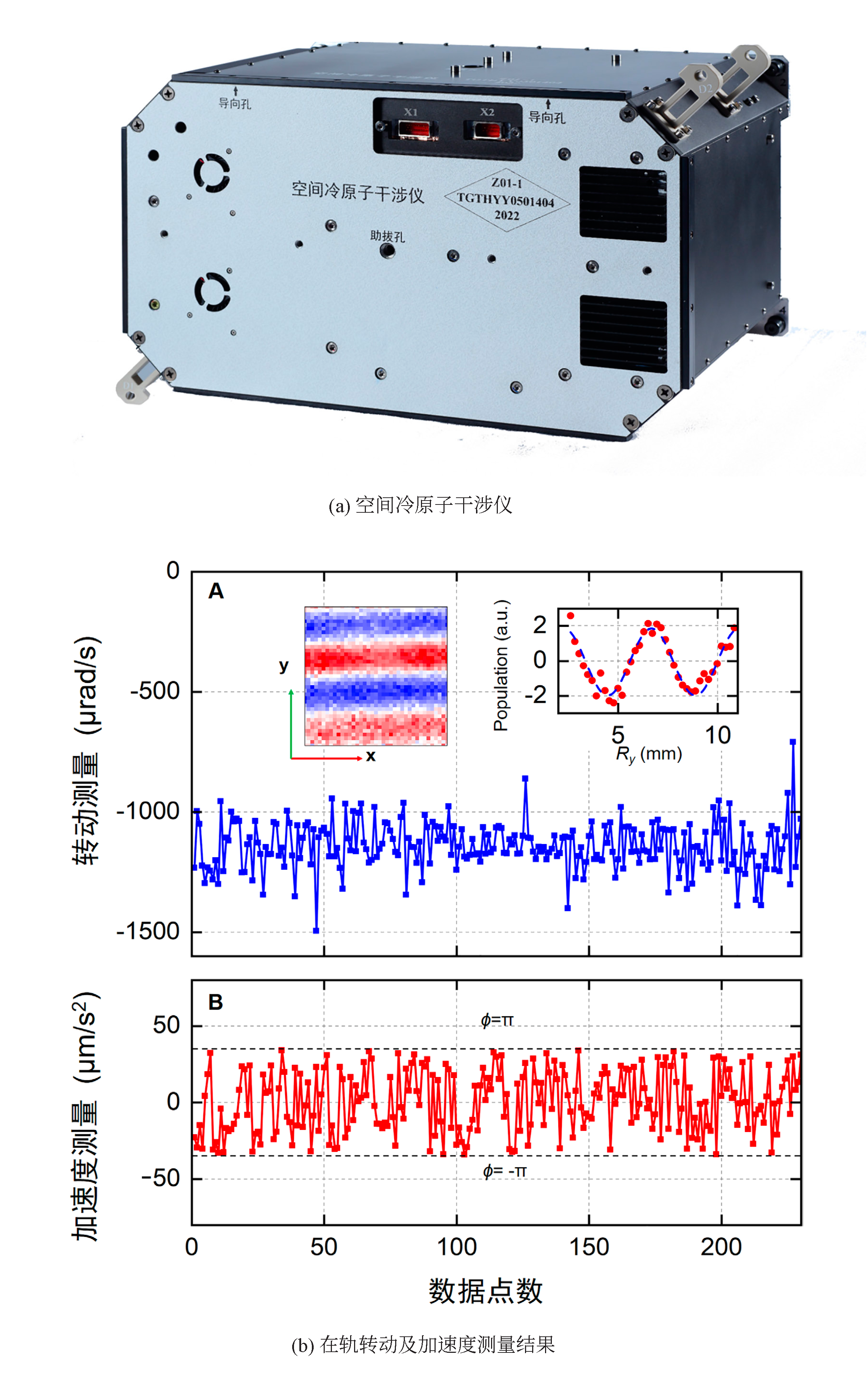 空间冷原子干涉仪在轨实物图(a)及相关惯性量实验测量结果(b)